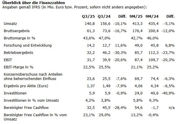 Die Elmos Semiconductor SE (FSE: ELG) zeigte im dritten Quartal 2025 eine robuste Entwicklung und konnte das EBIT und den bereinigten Free Cashflow gegenüber dem Vorquartal deutlich verbessern. Der Umsatz lag durch die Umstellung auf das neue SAP System S/4HANA und einer damit verbundenen Verschiebung von Aufträgen vom dritten in das vierte Quartal mit 140,8 Mio. Euro leicht unter dem Vorquartal (Q2 2025: 145,7 Mio. Euro). Die systembedingte Umsatzverschiebung hat keine Auswirkungen auf die Umsatzerwartung für das Gesamtjahr 2025. Das Ergebnis vor Zinsen und Steuern (EBIT) lag im dritten Quartal mit 31,7 Mio. Euro über dem Vorquartal (Q2 2025: 30,1 Mio. Euro). Die EBIT-Marge lag mit 22,5% ebenfalls über dem Vorquartal (Q2 2025: 20,6%). Die Investitionen in Sachanlagen und immaterielle Vermögenswerte abzüglich aktivierten Entwicklungsleistungen lagen mit 5,9 Mio. Euro bzw. 4,2% vom Umsatz auf dem niedrigen Niveau des Vorquartals (Q2 2025: 4,6 Mio. Euro bzw. 3,2% vom Umsatz). Mit 32,5 Mio. Euro bzw. 23,1% vom Umsatz hat sich der bereinigte Free Cashflow im dritten Quartal sehr erfreulich entwickelt. In den ersten neun Monaten erreichte der bereinigte Free Cashflow somit 54,6 Mio. Euro oder 13,2% vom Umsatz.