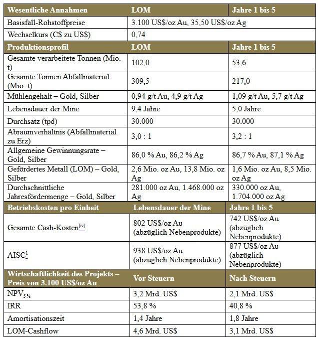 Bei den Basisfallparametern werden ein Goldpreis von 3.100 US$/oz und ein Silberpreis von 35,50 US$/oz sowie ein Wechselkurs (C$ zu US$) von 0,74 angenommen. Alle Währungen sind in US-Dollar, sofern nicht anders angegeben. Kapitalwert berechnet ab Baubeginn und ohne sämtliche Kosten vor der Errichtung.