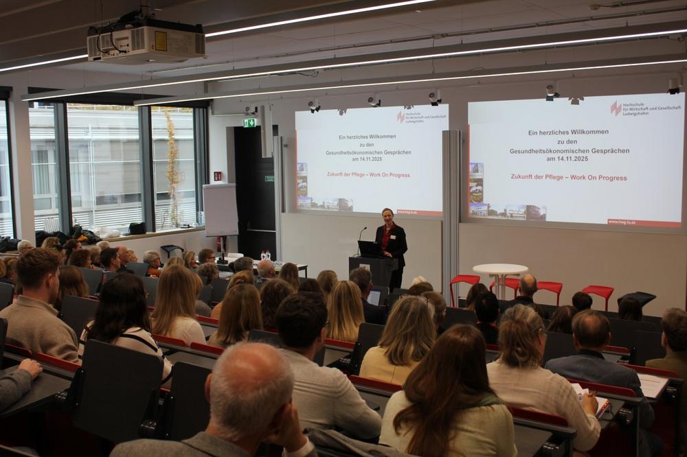 Am 14. November 2025 fanden an der Hochschule für Wirtschaft und Gesellschaft Ludwigshafen die Gesundheitsökonomischen Gespräche zum Thema „Zukunft der Pflege – Work on Progress" statt. Wie schon vielfach seit dem Start der Tagungsreihe in 2003 bot die Veranstaltung auch dieses Jahr eine Plattform für den fruchtbaren Austausch zwischen Hochschule und Praxis. Aus Sicht der Teilnehmerinnen und Teilnehmer war es besonders wertvoll, neben fundierten gesundheitspolitischen Analysen auch umsetzungsorientierte Konzepte für strategisch relevante Handlungsfelder kennenzulernen.