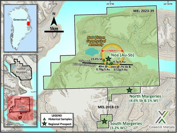 Frühere Exploration konzentrierte sich auf orogene Goldmineralisierungen, was bedeutet, dass die RIRGS-Ziele übersehen wurden. GreenX ist der Ansicht, dass die Antimon-Gold-Mineralisierung oberhalb des Plutons bei Noa mit dem Stibnite-Gold-Projekt von Perpetua Resources in Idaho (USA) vergleichbar sein könnte. Dort überlagern sich die RIRGS- und die orogenen Goldmineralisierungsarten ebenfalls.