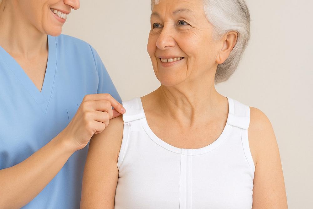 Nach einer Schulter-OP sind Über-Kopf-Bewegungen oft tabu oder nur unter starken Schmerzen möglich. Das saba Unterhemd wird um den Oberkörper gelegt und vorn geschlossen. Der operierte Arm kann in einer schmerzarmen Position bleiben, Hebebewegungen über 90 Grad werden vermieden. Der Anziehvorgang wird kalkulierbar – in Klinik, Reha und zu Hause.
