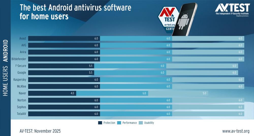 12 mobile security apps for Android were reviewed by the AV-TEST Institute in November 2025. We focused on realistic test scenarios, covering the areas of Protection, Performance, Usability and Features for all apps and services.
