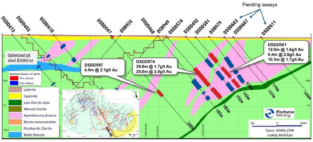 DSDD555: 6.8 g/t Au over an estimated true width of 35.5 meters from 48.6 meters, including