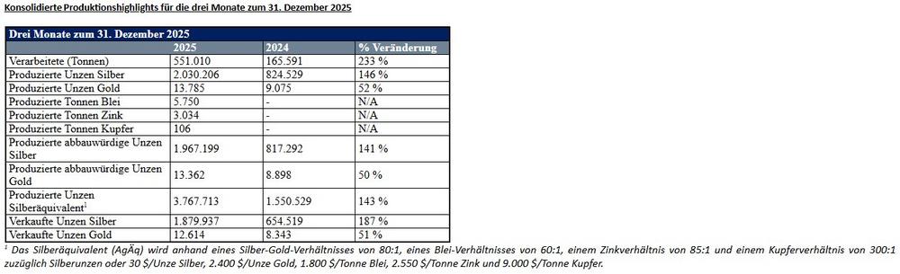 – Metallverkäufe und Lagerbestände: Im vierten Quartal wurden 1.879.937 Unzen Silber und 12.614 Unzen Gold verkauft. Zum 31. Dezember 2025 wurden insgesamt 262.131 Unzen Silber und 736 Unzen Gold in Form von Barren sowie 55.877 Unzen Silber und 861 Unzen Gold in Form von Konzentrat gelagert.