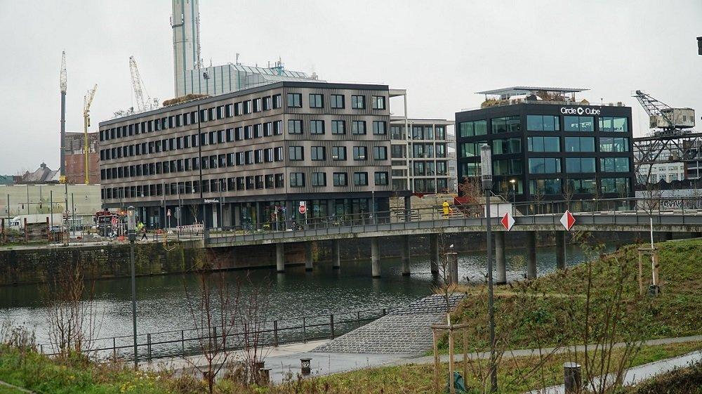 „Ein nicht alltägliches und recht komplexes Projekt“ nennt es denn auch MVV-Key-Account-Manager Pierre van Veldhoven. Ungewöhnlich ist die Architektur des Hybridhauses „Rockywood“, die auch namensgebend war: Der größere, L‑förmige Teil des Gebäudekomplexes besteht aus Holzmodulen in Stapelbauweise. Insgesamt 2.600 m3 Holz seien verbaut worden, was fast 2.400 t gespeichertem CO2 entspreche, so van Veldhoven. In diesem Gebäudeteil befinden sich vor allem Büros. Der zweite Teil des Ensembles, ein schwarzer, durch große Fensterflächen geprägter Kubus in klassischer Beton-Bauweise, bietet sich unter anderem für Veranstaltungen an. Aber auch in ihm spielt Holz eine Rolle. Auf den Dächern der Gebäudeteile befinden sich PV-Module, Kälteerzeugungs- und Lüftungsanlagen mit der dazugehörigen Wärmepumpe.