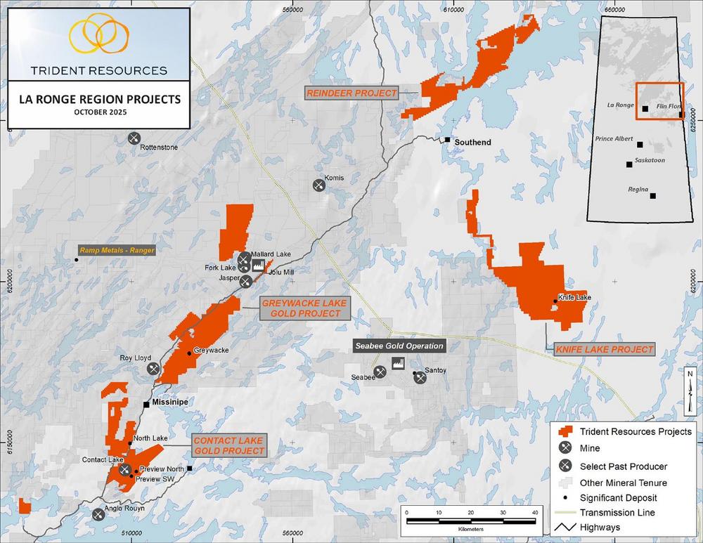 Das Goldprojekt Contact Lake erstreckt sich über eine Fläche von rund 22.790 Hektar und umfasst die ehemals aktive Goldmine Contact Lake, aus der während des aktiven Bergbaubetriebs zwischen 1994 und 1998 etwa 190.000 Unzen Gold bei einem Head-Gehalt von durchschnittlich 6,16 g/t Au gefördert wurden. Zum Zeitpunkt der Stilllegung der Mine lag der Goldpreis bei etwa 300 US$ pro Unze und Cameco Corporation meldete, dass noch beträchtliche nicht geförderte Goldressourcen verblieben. Das Konzessionsgebiet Contact Lake, das im überaus höffigen La Ronge Gold Belt in Saskatchewan gelegen ist, beherbergt auch die orogenen Goldlagerstätten Preview SW, Preview North und North Lake. Einschließlich der Lagerstätte Greywacke North, die 40 km nordöstlich von Contact Lake liegt, befinden sich diese vier Lagerstätten vollständig im Besitz von Trident Resources und beinhalten aktuelle geschätzte Mineralressourcen (siehe Pressemitteilung vom 24. November 2025), die keine Unzen aus dem ehemals produzierenden Zielgebiet Contact Lake einschließen.