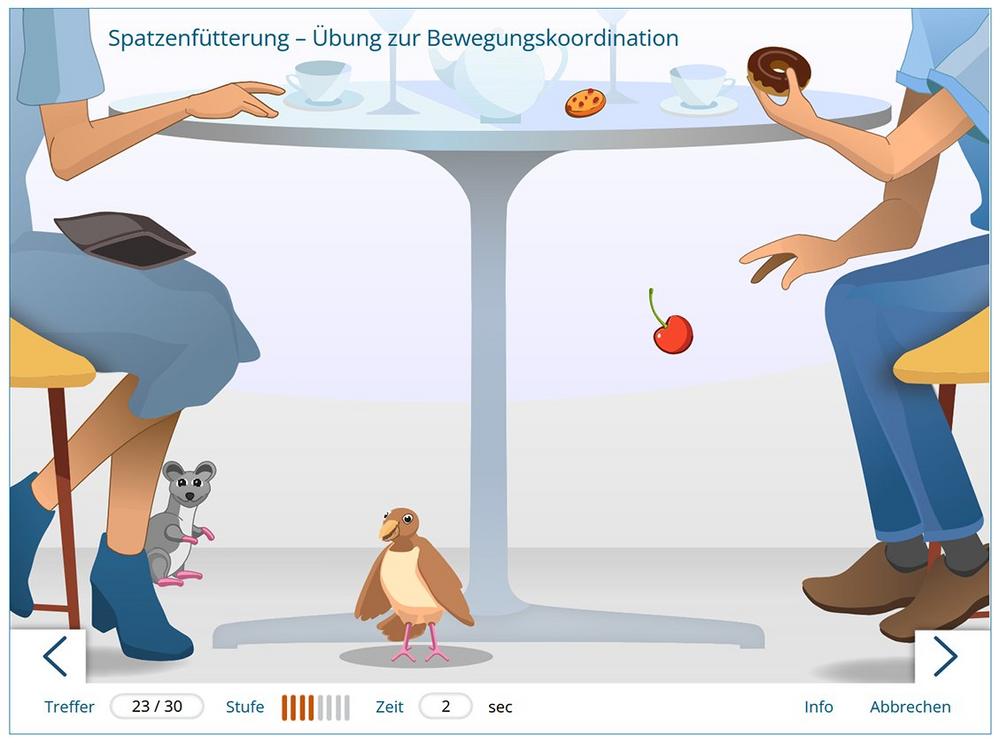 Die neue Übung Spatzenfütterung behandelt das Thema Bewegung und stärkt die kognitive Flexibilität und die Priorisierungsfähigkeiten. Mit dem simulierten Gefühl des Sich-Bewegens werden in diesem interaktiven Spiel insbesondere die Reaktionszeit, die geteilte Aufmerksamkeit und die Hand-Augen-Koordination beim Antizipieren der verschiedenen Bewegungsgeschwindigkeiten geschult. Helfen Sie dem Vogel beim Auffangen der vom Tisch herabfallenden Nahrung. Doch Vorsicht – nicht alles ist essbar und manchmal taucht eine Maus auf, die ihm Nahrung stiehlt. Wird die Maus nicht rechtzeitig vertrieben, wird der Spatz langsamer oder friert in der Bewegung kurz ein. Mit jeder Schwierigkeitsstufe steigt die Geschwindigkeit.