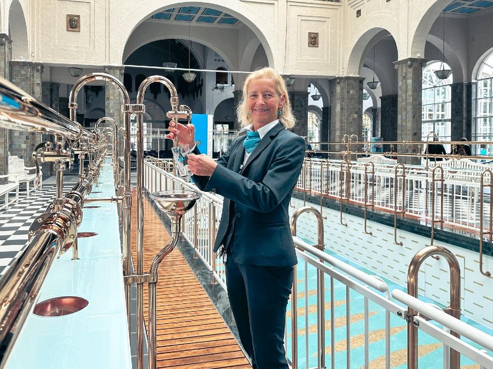 In Bad Kissingen sprudeln sieben einzigartige mineralstoffreiche Heilquellen und begründen bis heute seinen Ruf als Weltbad. Die heilende, lindernde und vorbeugende Wirkung von Heilwasser erkannten Mediziner schon vor 500 Jahren. Bereits seit den 1830er Jahren gibt es Personal, das Heilwasser ausschenkt. „Zur damaligen Zeit konnten sich Gäste und Einheimische noch selbst an den Brunnen bedienen, allerdings lag der Wasserspiegel sehr tief, weswegen es vielen Menschen zu mühsam war, bis zum Brunnen hinabzusteigen. Dadurch etablierte sich schnell eine neue Dienstleistung: die personelle Hilfe und Unterstützung beim Ausschank“, erzählt Sabine Krimmel, eine der Brunnenfrauen in Bad Kissingen. Im Jahr 1911 wurde die Wandelhalle mit integrierter Brunnenhalle eröffnet: Seitdem schenken die Brunnenfrauen das Heilwasser aus, auf Wunsch auch erwärmt, und können es von seiner natürlichen Kohlensäure befreien.