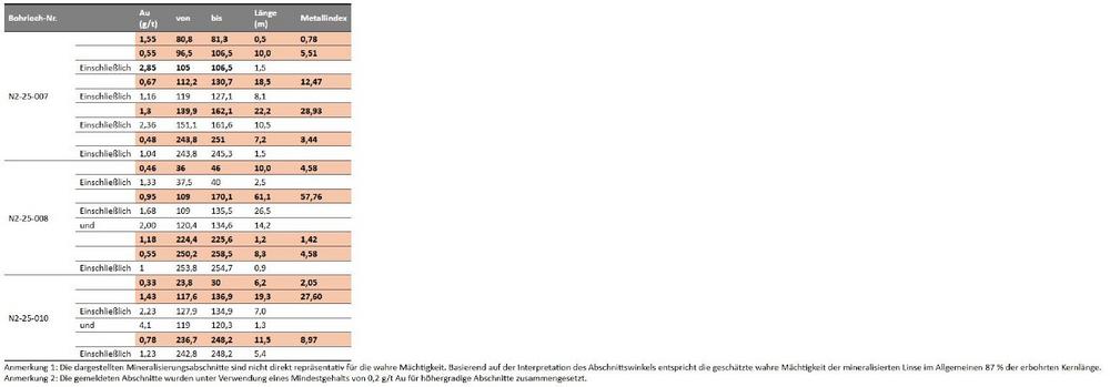 – N2-25-005: 0,91 g/t Au über 42,3 Meter ab 14,0 Metern Bohrlochtiefe, 9,9 Meter vertikale Tiefe. Höhepunkt sind die Teilabschnitte von 8,1 Metern mit 2,04 g/t Au bzw. 11,4 Metern mit 1,31 g/t Au.