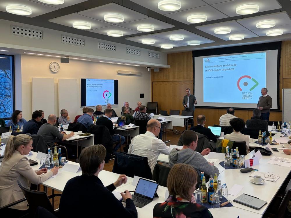 Anschließend ist es an Sven Lachmann, die Ergebnisse der Evaluation vorzustellen. Seit Juli 2025 hat er unter Vereins- und Beiratsmitgliedern sowie bei Mitarbeitern des LEADER-Teams in Workshops und Interviews Informationen gesammelt. Dabei zeigt sich, dass die LEADER-Region im Vogelsberg etabliert ist und in der laufenden Förderperiode bereits eine Vielzahl von Projekten erfolgreich unterstützt und gefördert wurde. Gleichzeitig wurden organisatorische Strukturen dort angepasst, wo in der laufenden Periode Handlungsbedarf erkannt wurde. Positiv bewertet wird auch die Mischung aus Vereinen, Unternehmen und Kommunen, die sich im Auswahlverfahren mit ihren Projektvorhaben im LEADER-Entscheidungsgremium durchsetzen.