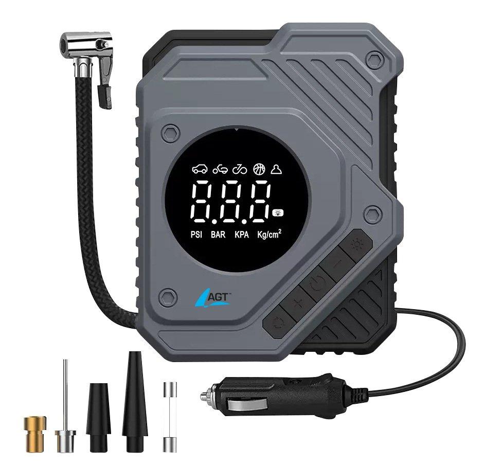 Schnelles Aufpumpen aller Reifen: Der 12-V-Kompressor von AGT bringt Auto-, Motorrad- oder Fahrradreifen zuverlässig auf den richtigen Druck – besonders praktisch, wenn unterwegs schnelles Handeln gefragt ist. Der gewünschte Druck lässt sich präzise am digitalen LED-Display einstellen und ablesen.