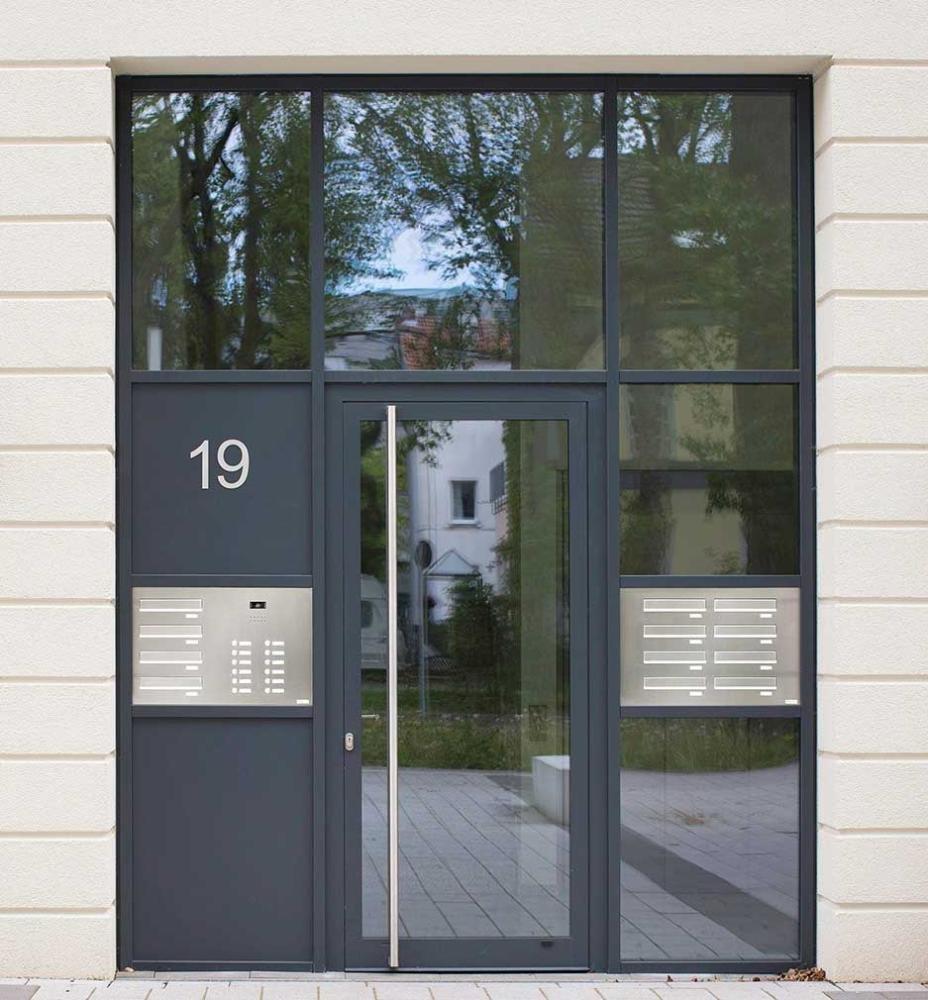 Türseitenteil-Anlagen bündeln Postempfang und Türkommunikation. Der Einwurf erfolgt von außen, die Entnahme geschützt von innen. Damit ist eine Postzustellung möglich, ohne dass Zusteller das Gebäude betreten müssen. Die von KNOBLOCH angebotenen Anlagen bieten eine hohe Sicherheit gegenüber Einbrechern (Schutzklasse RC2), die mit der Widerstandsfähigkeit einer soliden Haustür vergleichbar ist. Klar strukturierte Namensfelder erhöhen Übersichtlichkeit und Nutzerkomfort.