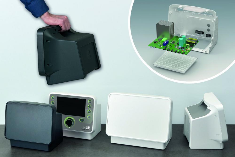 Erhältlich in zwei Größen – „S“ (283 × 246 × 194 mm) und „M“ (344 × 274 × 219 mm) – bietet das Gehäuse viel Platz für große Bauteile. Die geneigte Bedienfront gestattet nicht nur eine gute Ablesbarkeit aus ver schiedenen Blickwinkeln, sie schützt gleichzeitig auch Folientastaturen. Die plane Fläche darunter eignet sich für Bedienelemente oder Bedruckungen. Auf der Rückseite befindet sich ein zurückversetzter Bereich zum Schutz von Anschlüssen.
