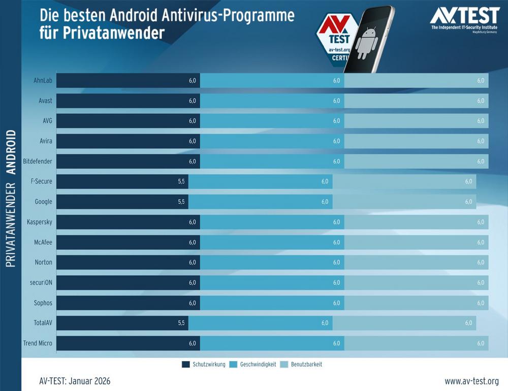 14 Sicherheitslösungen für Android hat das AV-TEST Institut im Januar 2026 geprüft. Alle Apps und Services wurden in realistischen Tests in den Bereichen Schutzwirkung (Protection), Geschwindigkeit (Performance), Benutzbarkeit (Usability) und weiteren Funktionen (Features) untersucht.