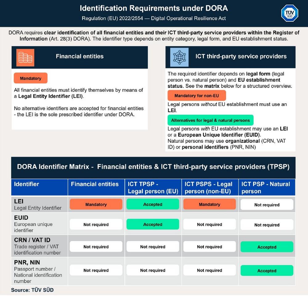 DORA-regulierte Organisationen müssen gemäß Kapitel III sowohl zur eigenen Identifikation im Informationsregister als auch für alle IKT-Drittdienstleister, bei denen es sich um juristische Personen handelt, eine gültige und aktive Rechtsträgerkennung (Legal Entity Identifier, kurz: "LEI") haben. Für IKT-Dienstleister können auch die in Artikel 16 der Richtlinie (EU) 2017/1132 genannte europäische einheitliche Kennung (European Unique Identifier, kurz: "EUID") bzw., sofern vorhanden, beide Kennungen angeben werden. Diese sind für eine korrekte Identifizierung unerlässlich und müssen bei der Meldung von IKT-Vorfällen verwendet werden. Die Rechtsträgererkennung wird von der Global Legal Entity Identifier Foundation (GLEIF) betrieben und kann durch akkreditierte Organisationen geprüft und ausgegeben werden.