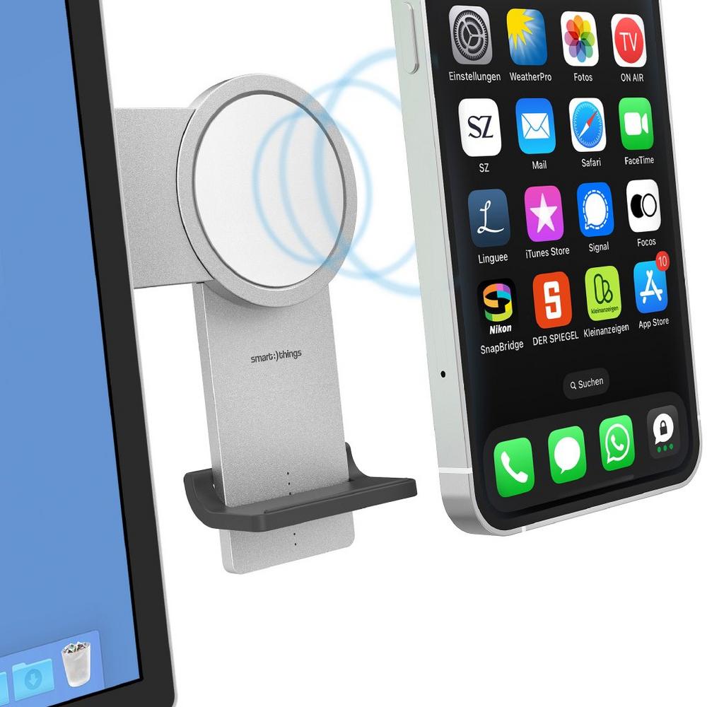 PhoneBase kombiniert induktives Laden mit intelligenter Positionierung: Die Halterung wird direkt an der Seite des Monitors befestigt und nutzt die USB-Anschlüsse am Bildschirm (USB-C oder USB-A) zur Stromversorgung – ohne zusätzliche Netzteile oder Kabelgewirr auf dem Schreibtisch. Durch das Qi-Wireless-Charging-Prinzip und die MagSafe-Magnetik hält und lädt es Smartphones kabellos und sicher in Reichweite des Nutzers.