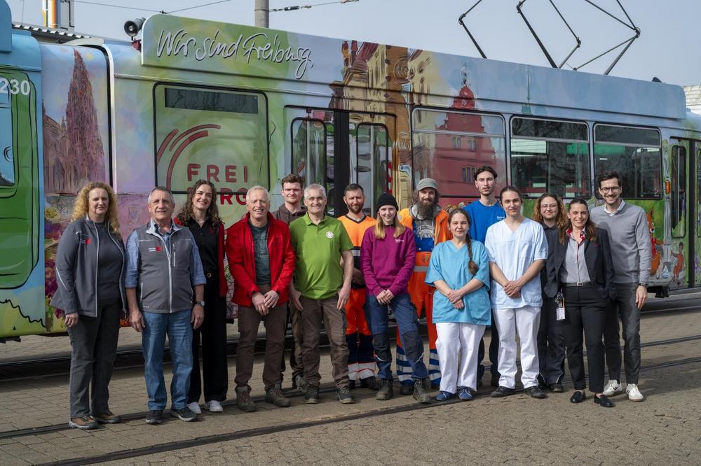 Oberbürgermeister Martin Horn stellte die neu beklebte Straßenbahn gemeinsam mit Mitarbeitenden der städtischen Gesellschaften vor. Horns zentrale Botschaft: Hinter der hohen Lebensqualität in Freiburg stehen viele helfende Hände. Vieles, was in Freiburg selbstverständlich funktioniert, sei das Ergebnis der täglichen Arbeit zahlreicher Mitarbeitender im Stadtkonzern: Verkehr, Sauberkeit, Energieversorgung, Wohnen, Freizeitangebote, Kultur und Grünflächen.