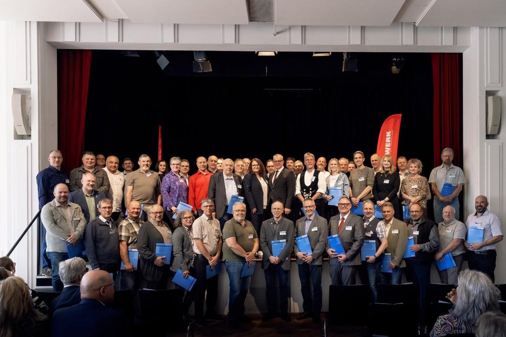 Hinter jedem Ehrenamt stehen auch Familien, Partnerinnen und Partner sowie Freunde, die den engagierten Handwerkerinnen und Handwerkern den Rücken freihalten. Viele von ihnen kennen den Satz „Schon wieder Kammer, schon wieder Innung.“ Und trotzdem unterstützen sie das Engagement. „Ohne dieses Verständnis wäre vieles von dem, was Sie leisten, nicht möglich“, betonte Wälde. „Auch ihnen gebührt unser aufrichtiger und herzlicher Dank.“ Dafür ehrte die Handwerkskammer Reutlingen ihre Ehrenamtlichen aus den Landkreisen Freudenstadt, Reutlingen, Sigmaringen, Tübingen und Zollernalb mit insgesamt 273 Auszeichnungen. 93 Persönlichkeiten erhielten die Alfred-Geisel-Medaille, 98 Ehrenamtliche wurden mit dem Silbernen Handwerkszeichen ausgezeichnet und 82 Personen bekamen das Goldene Handwerkszeichen verliehen.