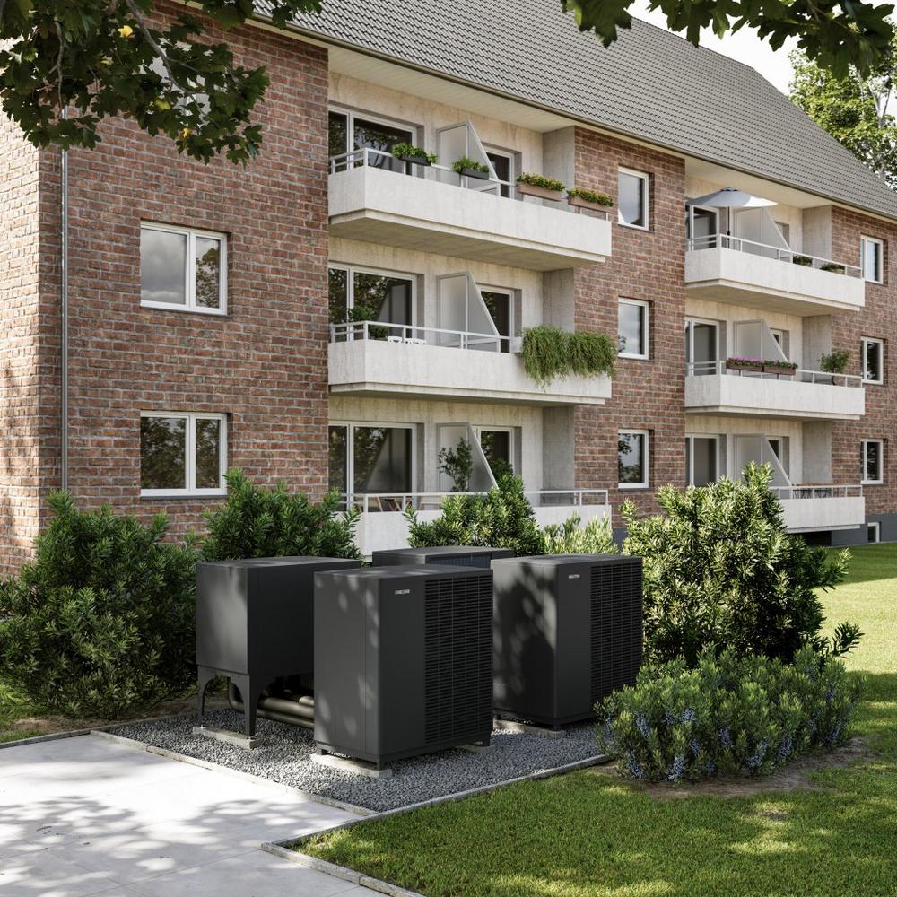 Das Kaskadenmodul wird im gleichen Look und mit der gleichen Aufstellfläche wie die Wärmepumpen selbst angeboten. Burkhard Max: „Dadurch fügt sich das Hydraulikmodul perfekt in die Optik der Gesamtanlage ein.“ Die Anordnung der Wärmepumpen und die Aufstellung des Moduls können dank der flexiblen Anschlussmöglichkeiten der Kaskadengeräte frei gewählt werden.