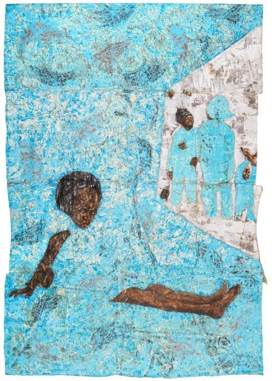 Nyamais Arbeiten zeichnen sich durch komplexe Strukturen und intensive Farbgestaltungen aus. Ge-nähte Elemente und vielschichtige Materialien verbinden historische und kulturelle Erzählungen zu monumentalen „Bildern“.