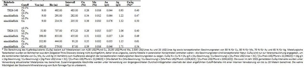 - Die Bohrung TH26-151 untersuchte die nördliche Ausdehnung der porphyrgebundenen Kupfer-Molybdän-Mineralisierung und durchteufte: