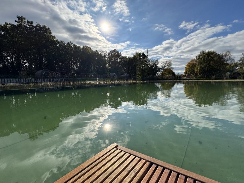 Das Naturerlebnis setzt sich im Badebereich fort: Der naturnahe Schwimmpool kommt ohne chemische Zusätze aus und wird durch Pflanzen und Filtersysteme gereinigt – für ein Badeerlebnis im Einklang mit der Umwelt.