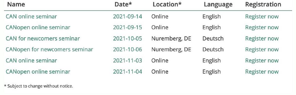 CAN in Automation (CiA) has scheduled six seminars for the last quarter of 2021. Besides four online seminars (two CAN, two CANopen), two of them (one CAN, one CANopen) are scheduled as on-site events. The online seminars provide in a compact way the contents of the on-site seminars. The CAN seminars take place on September […]