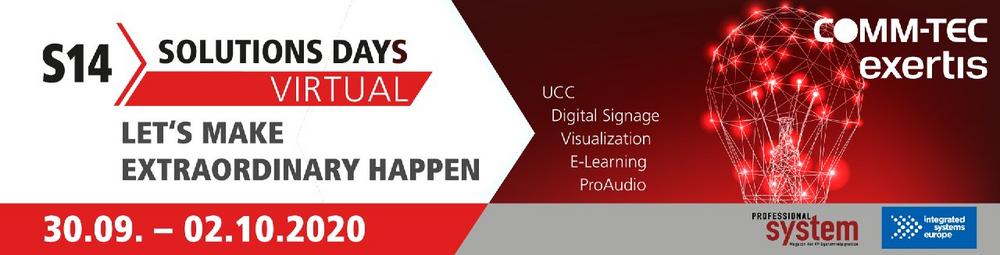 Unter dem Motto „Let`s make extraordinary happen“ lädt COMM-TEC Exertis von 30.09. bis 02.10.2020 zu den Virtual S14 Solutions Days. Insgesamt 40 Hersteller präsentieren an mehr als 30 virtuellen Messeständen in fünf Messehallen aktuelle Neuheiten und Highlights aus den Themenbereichen UCC & Collaboration, Digital Signage, Visualization, E-Learning und ProAudio. Dabei präsentieren sich auch einige neue […]