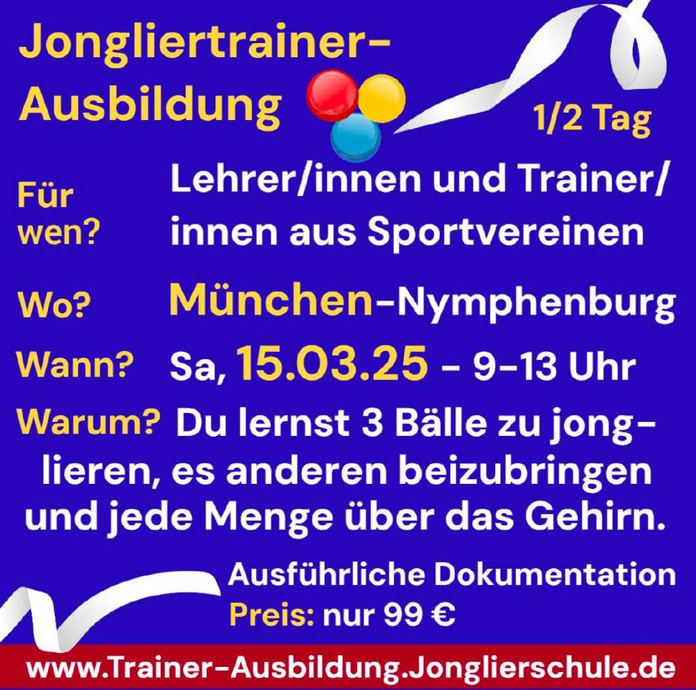 Stephan Ehlers leitet die Jonglierschule München und ist als 4-facher Welterkordinhaber im Jonglieren-Lernen auch Deutschlands erfolgreichster Jongliertrainer. Zwei Mal im Jahr können Lehrer/innen und Trainer/innen aus Sportvereinen bei ihm in einem Intensivkurs drei Dinge lernen: Man lernt selbst das Jonglieren mit 3 Bällen (wenn man es nicht schon kann) Es wird gezeigt und erklärt, wie […]