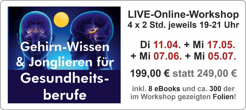 Di 18.04.23 – 14:00 Uhr Warum Jonglieren wirksam Demenz- und Alzheimerkrankheiten vorbeugt In diesem 30 Minuten-LIVE-Online-Workshop erklärt Stephan Ehlers, warum das Jonglieren mit 1, 2 oder 3 Bällen wirksam Demenz- und Alzheimerkrankheiten vorbeugen kann. Außerdem wird er die neurobiologischen Gründe nennen, warum kleine Übungen mit nur einem Ball die Aufmerksamkeit, Konzentration und das Gedächtnis verbessern helfen. Voraussetzungen […]