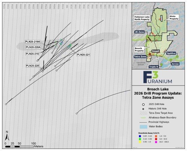 F3 Uranium Corp. (TSV: FUU) (OTCQB: FUUFF) („F3“ oder „das Unternehmen“) freut sich, die letzten Analyseergebnisse des Bohrprogramms 2025 in der Zone Tetra im Konzessionsgebiet Broach bekannt zu geben, einschließlich Bohrloch PLN25-219A (siehe Pressemitteilungen vom 10. November 2025 und 13. Januar 2026), das einen Hauptmineralisierungsabschnitt von 13,0 m mit 0,28 % U3O8 lieferte, einschließlich dreier hochgradiger Teilabschnitte: 3,0 m […]