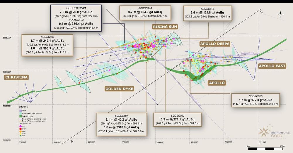 SXG erweitert hochgradige Mineralisierung 150 m neigungsabwärts bei Rising Sun West, bohrt 7,0 Meter @ 16,7 g/t Gold und hebt die Bedeutung von Antimon in Sunday Creek hervor